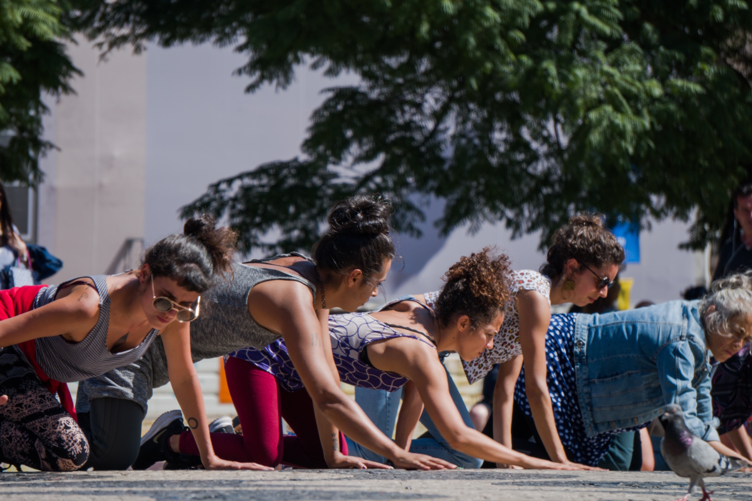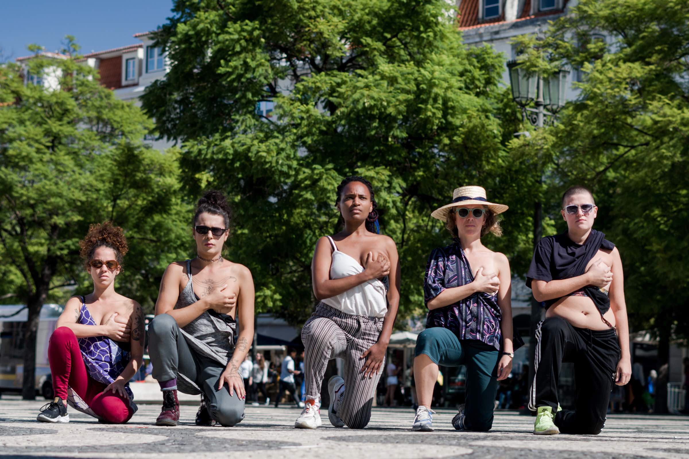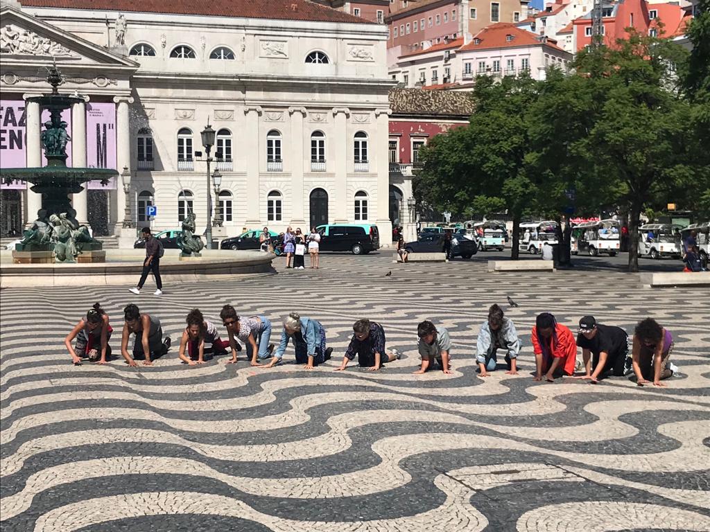 Here we are in this little step happens through workshop-residencies where choreographic materials developed by Michelle Moura and Sara Anjo are shared. These are transformed through the relationship with the public space and in dialogue with the reality of the performers.